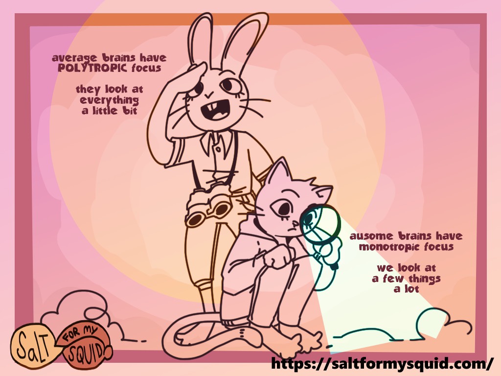 Potresti anche goderti questo video di 2 minuti di NeuroPride Ireland o questo video di 11 minuti e mezzo di Autistamatic; Damian Milton parla di monotropismo e stati di flusso (9 minuti); o Dinah e Fergus Murray sul podcast Different Minds (34 minuti). Se preferisci un tipo di presentazione di presentazione, prova questo da Autienelle o questo en español; o questo fumetto di Neuro Divers.